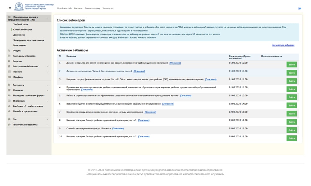 Прямые эфиры регулярно проходят онлайн, а после трансляции доступны в записи. В разделе «Список вебинаров» вы найдете как завершенные трансляции, так и запланированные на месяц. Участники каждой живой встречи получают сертификаты.