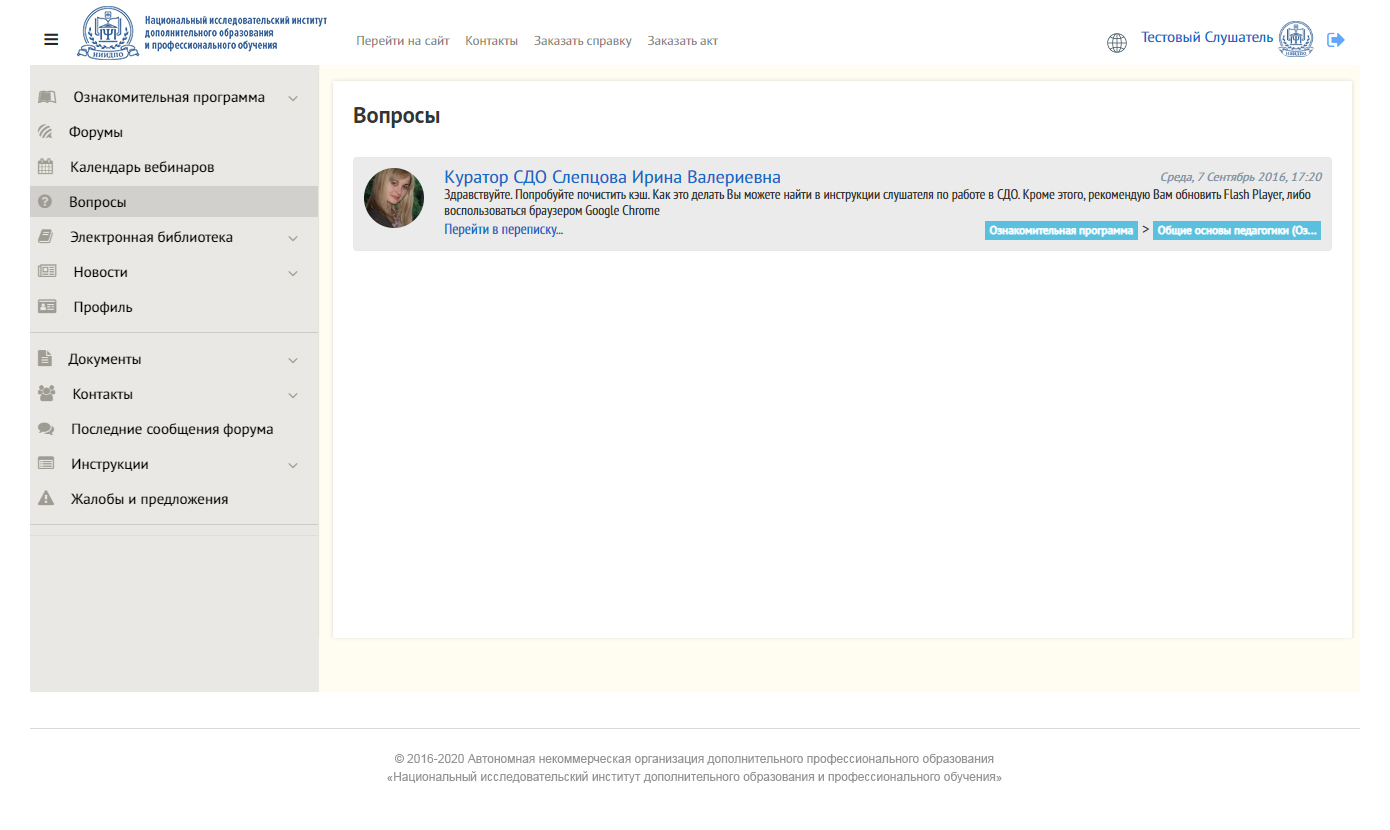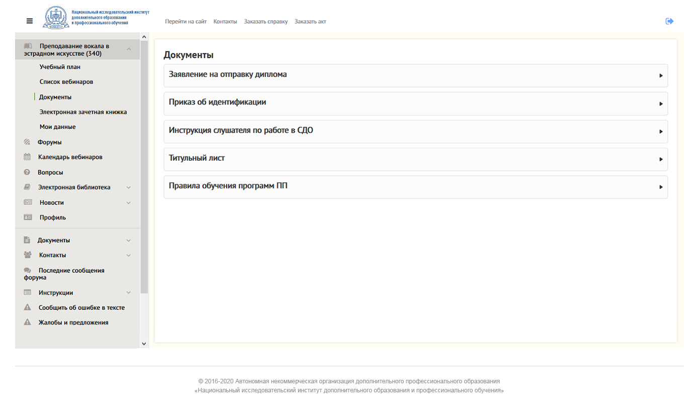 Заочное обучение с применением дистанционных* образовательных технологий проходит в системе дистанционного обучения (СДО). Обучающиеся могут изучать лекции, смотреть вебинары онлайн и в записи, выполнять практические задания, проходить итоговый контроль знаний.