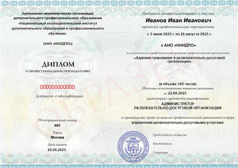 - Квалификация: Администратор развлекательно-досуговой организации