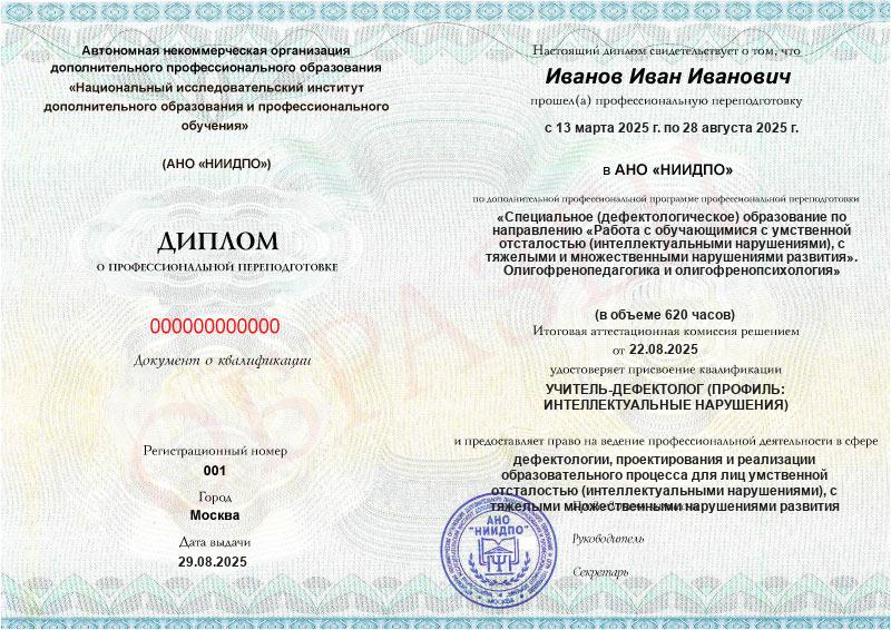 Специальное (дефектологическое) образование по направлению «Работа с обучающимися с умственной отсталостью (интеллектуальными нарушениями), с тяжелыми и множественными нарушениями развития». Олигофренопедагогика и олигофренопсихология (620ч)