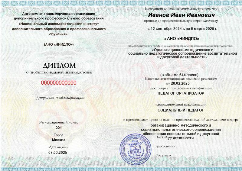 Диплом о профессиональной переподготовке с двумя квалификациями «Педагог-организатор», «Социальный педагог».Диплом действует на территории всей России и признается государственными и частными организациями.