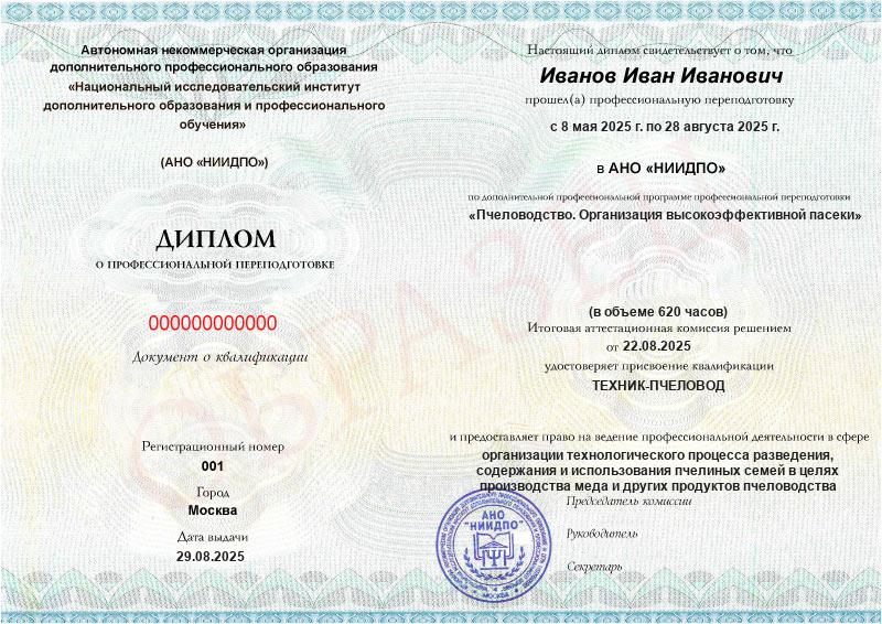 • Квалификация: Техник-пчеловод