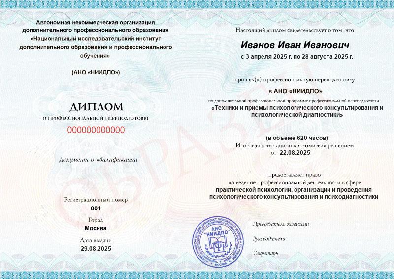 Диплом о профессиональной переподготовке от АНО «НИИПДО»Диплом действует на территории всей России и признается государственными и частными организациями