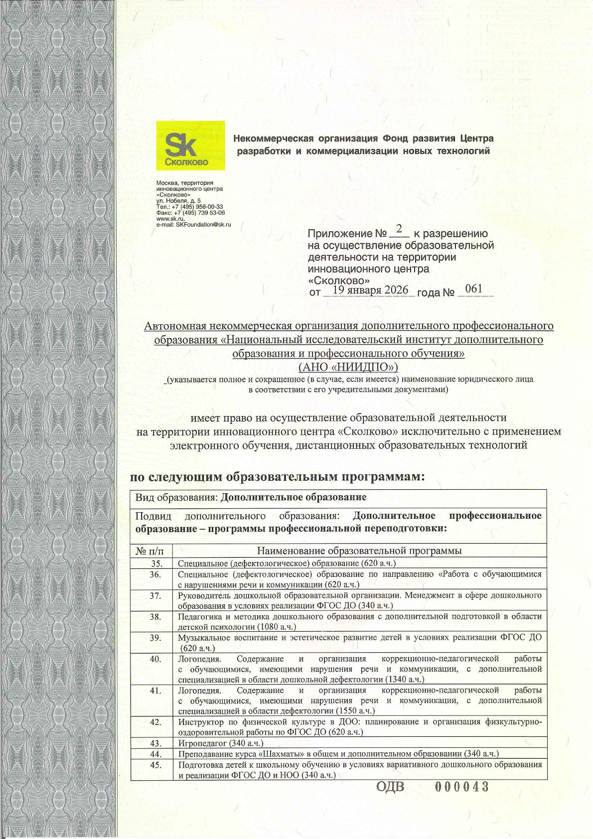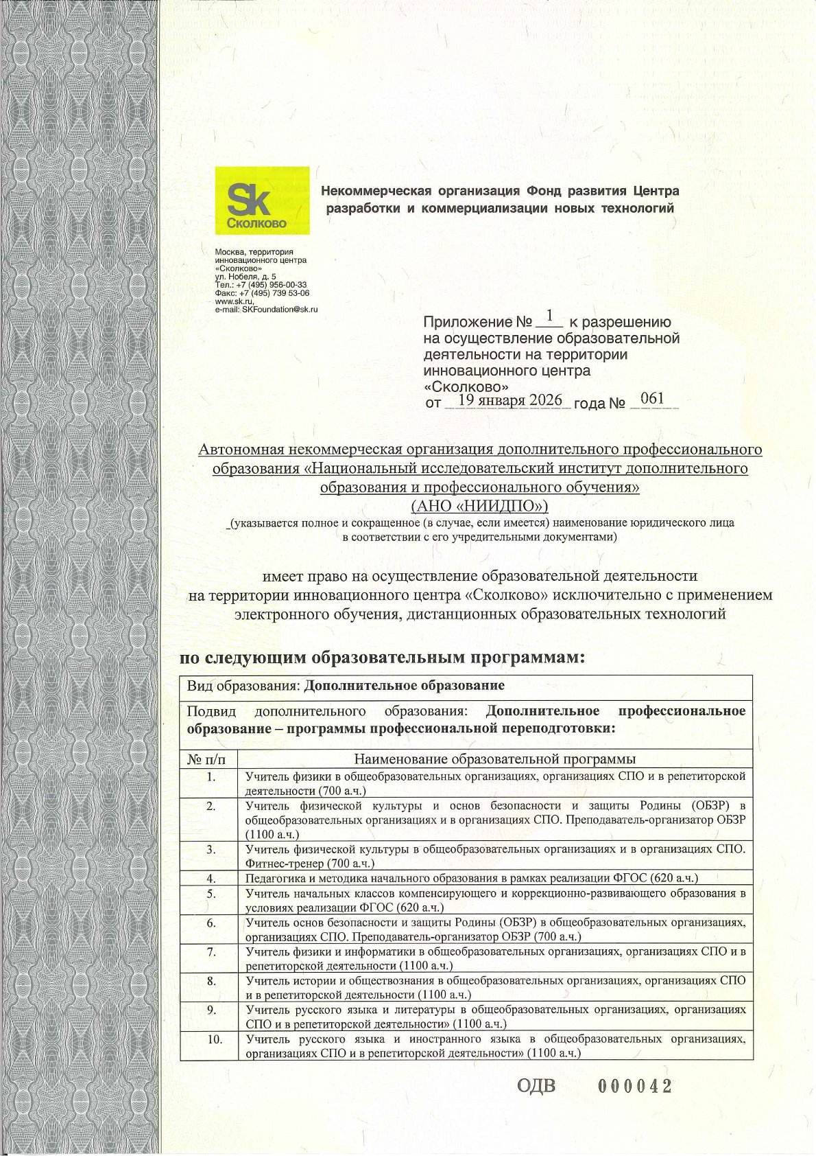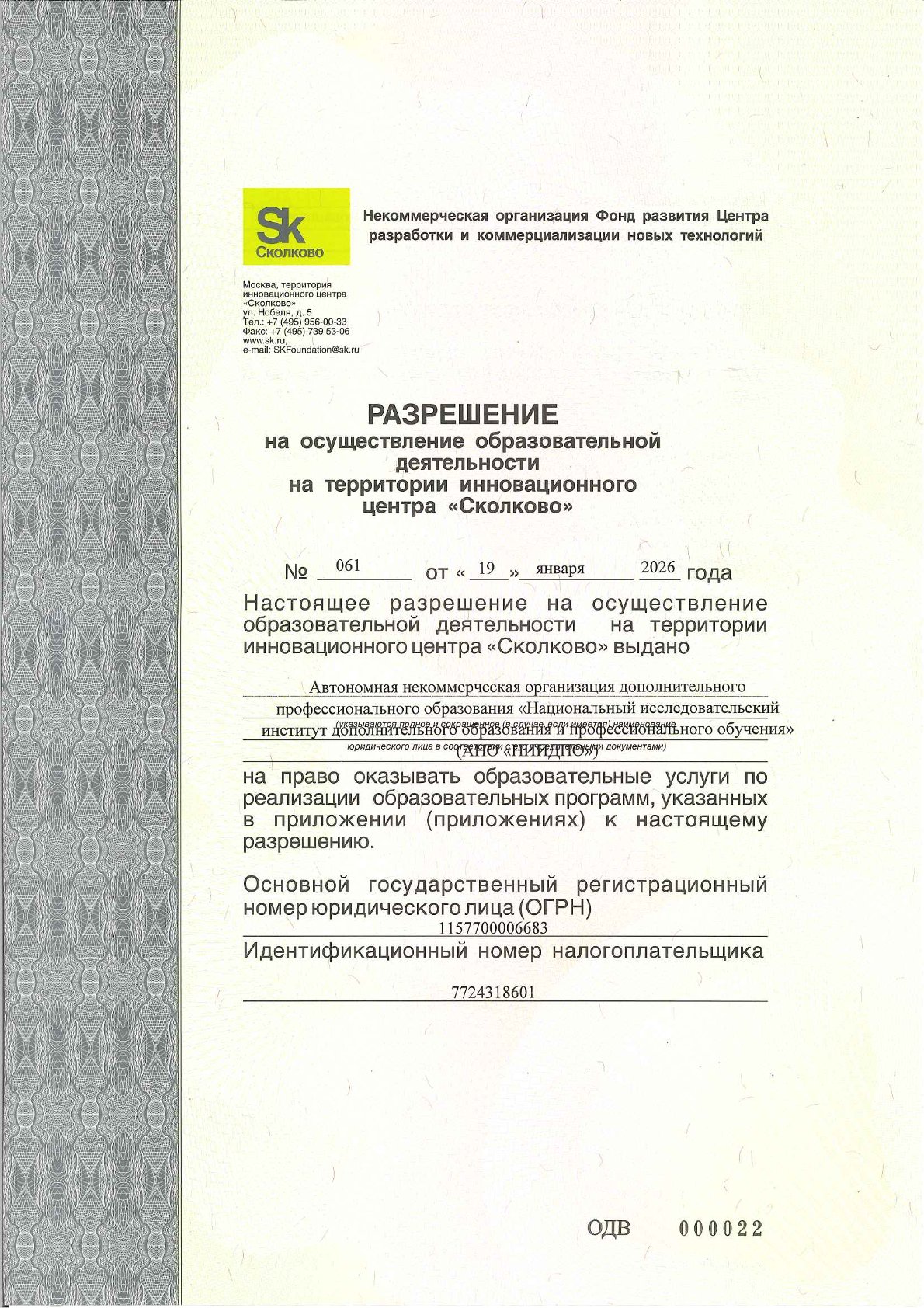 Разрешение на осуществление образовательной деятельности на территории инновационного центра «Сколково» № 061 от 19 января 2026 г.*