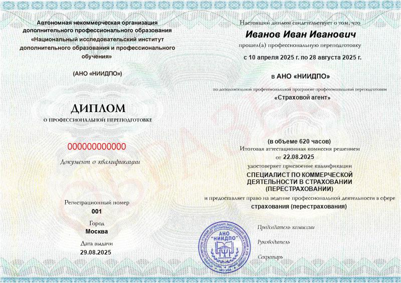 - Квалификация: Специалист по коммерческой деятельности в страховании (перестраховании)
