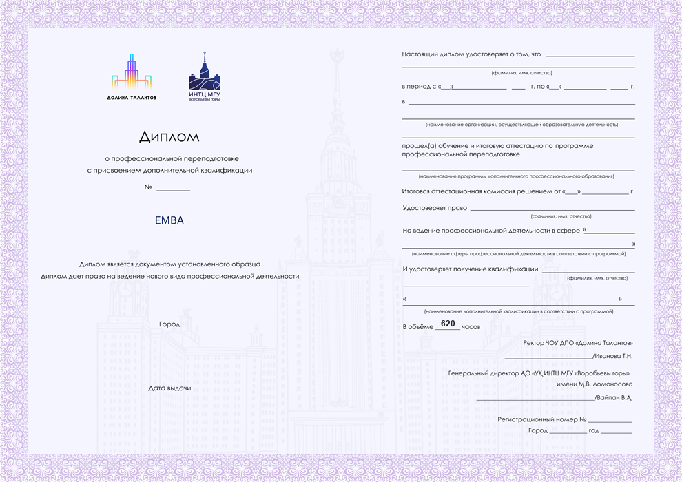 - Получите сразу два диплома от АНО «НИИДПО» и ИНТЦ МГУ «Воробьевы горы», подтверждающие вашу квалификацию и экспертность