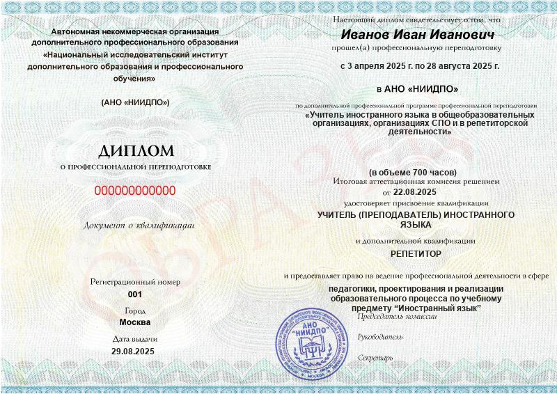 - 2 квалификации: Учитель (преподаватель) иностранного языка + Репетитор