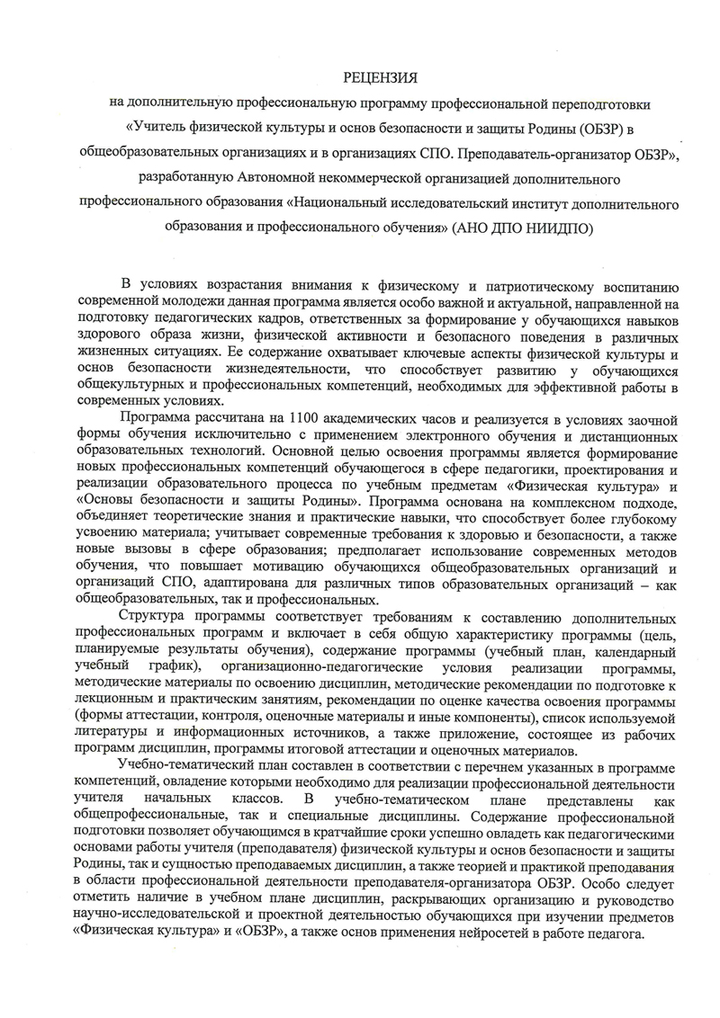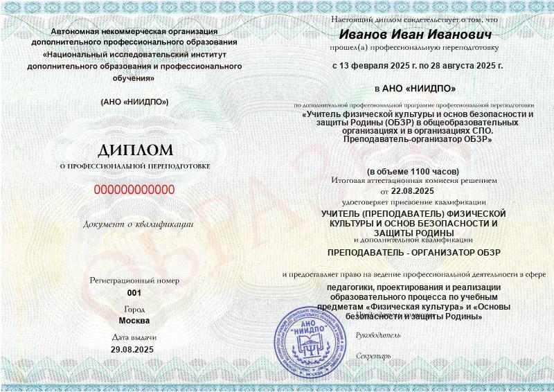 Учитель физической культуры и основ безопасности и защиты Родины (ОБЗР) в общеобразовательных организациях и в организациях СПО. Преподаватель-организатор ОБЗР (1100ч)