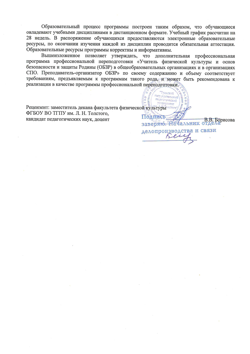 Читайте рецензию заместителя декана факультета физической культуры ФГБОУ ВО «Тульский государственный педагогический университет им. Л.Н. Толстого», кандидата педагогических наук, доцента Борисовой В.В.