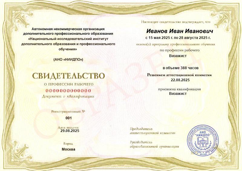Свидетельство о профессии c присвоением квалификации «Визажист»Свидетельство действует на территории всей России и признается государственными и частными организациями
